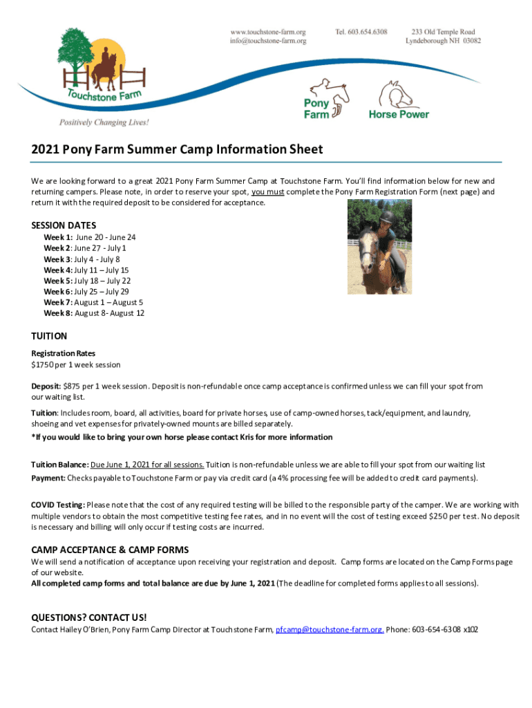 2021 Pony Farm Summer Camp Information Sheet We are looking forward to a great 2021 Pony Farm Summer Camp at Touchstone Farm. You'll find information below for new and returning campers. Please note,