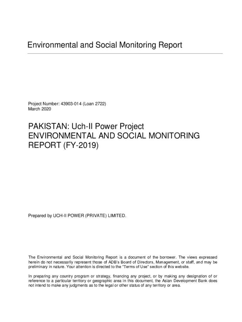 Environmental and Social Monitoring ReportProject Number: 43903014 (Loan 2722) March 2020PAKISTAN: Chip Power Project ENVIRONMENTAL AND SOCIAL MONITORING REPORT (FY2019)Prepared by CHIP POWER (PRIVATE)