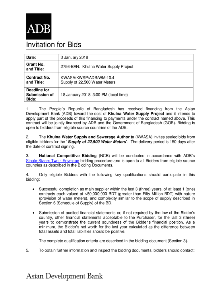 Invitation for Bids Date:3 January 2018Grant No. and Title:2756BAN: Khulna Water Supply ProjectContract No. and Title:KW ASA/WSP/ADB/WM10.4 Supply of 22,500 Water MetersDeadline for Submission of
