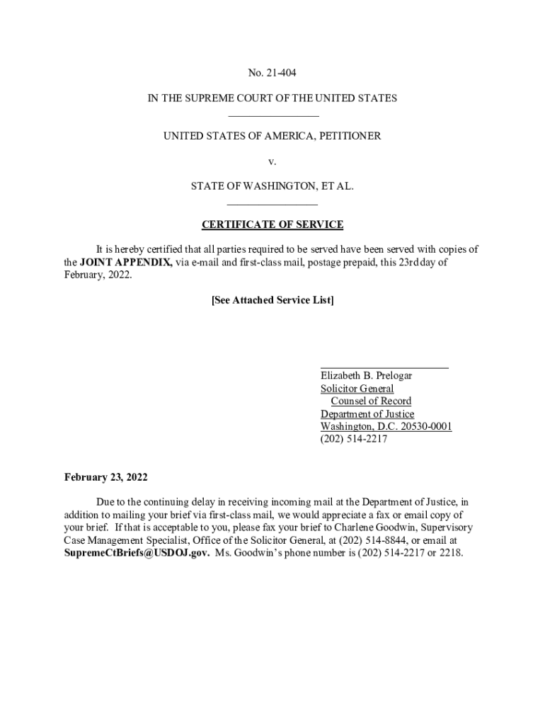 No. 21404 IN THE SUPREME COURT OF THE UNITED STATES ___ UNITED STATES OF AMERICA, PETITIONER v. STATE OF WASHINGTON, ET AL. ___ CERTIFICATE OF SERVICE It is hereby certified that all parties required