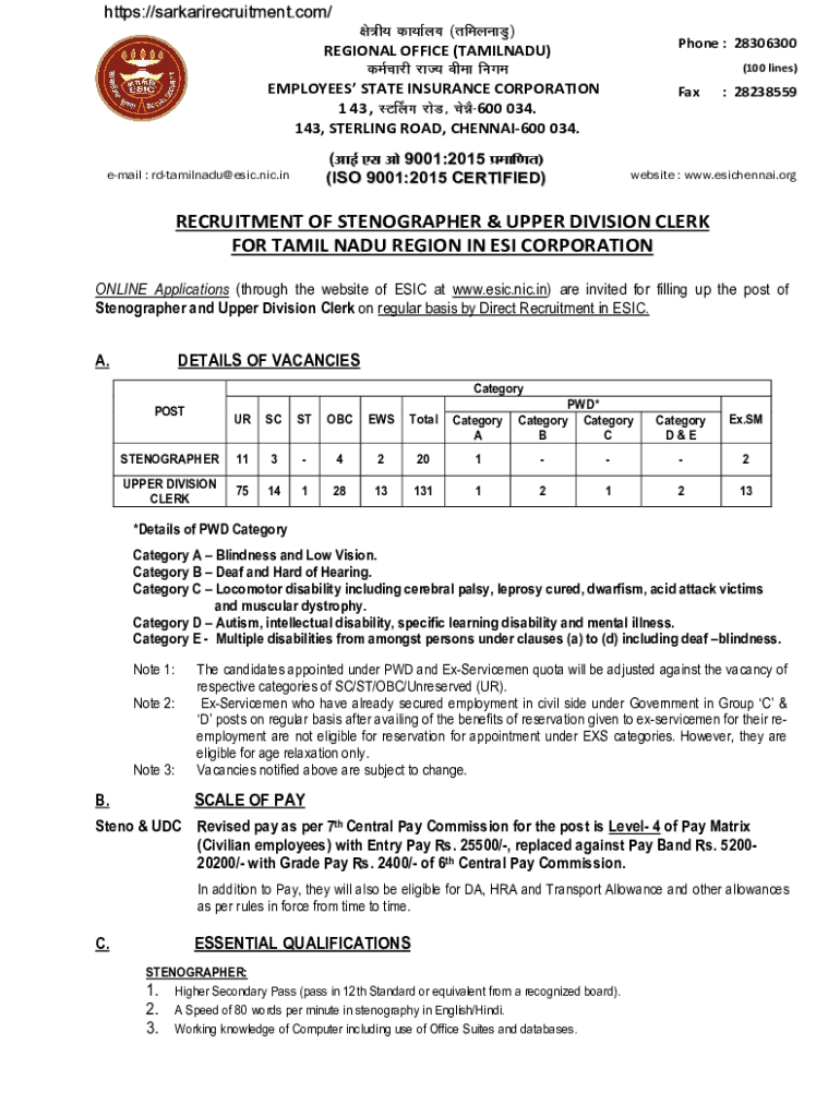 HTTPS://sarkarirecruitment.com/Ij E (IVB)Phone : 28306300REGIONAL OFFICE (Tamil Nadu)(100 lines)ES V employees STATE INSURANCE CORPORATION 143,’M b, Sz600 034. 143, STERLING ROAD, CHENNAI600 034.