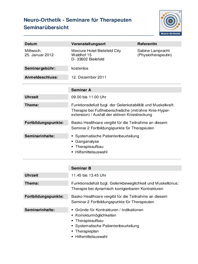 NeuroOrthetik Seminar for Therapeutic Seminarbersicht ___ DatumVeranstaltungsortReferentinMittwoch, 25. January 2012Mercure Hotel Bielefeld City Waldo 15 D 33602 BielefeldSabine Lamprey (Physiotherapeutin)Seminargebhr:kostenlosAnmeldeschluss:12.