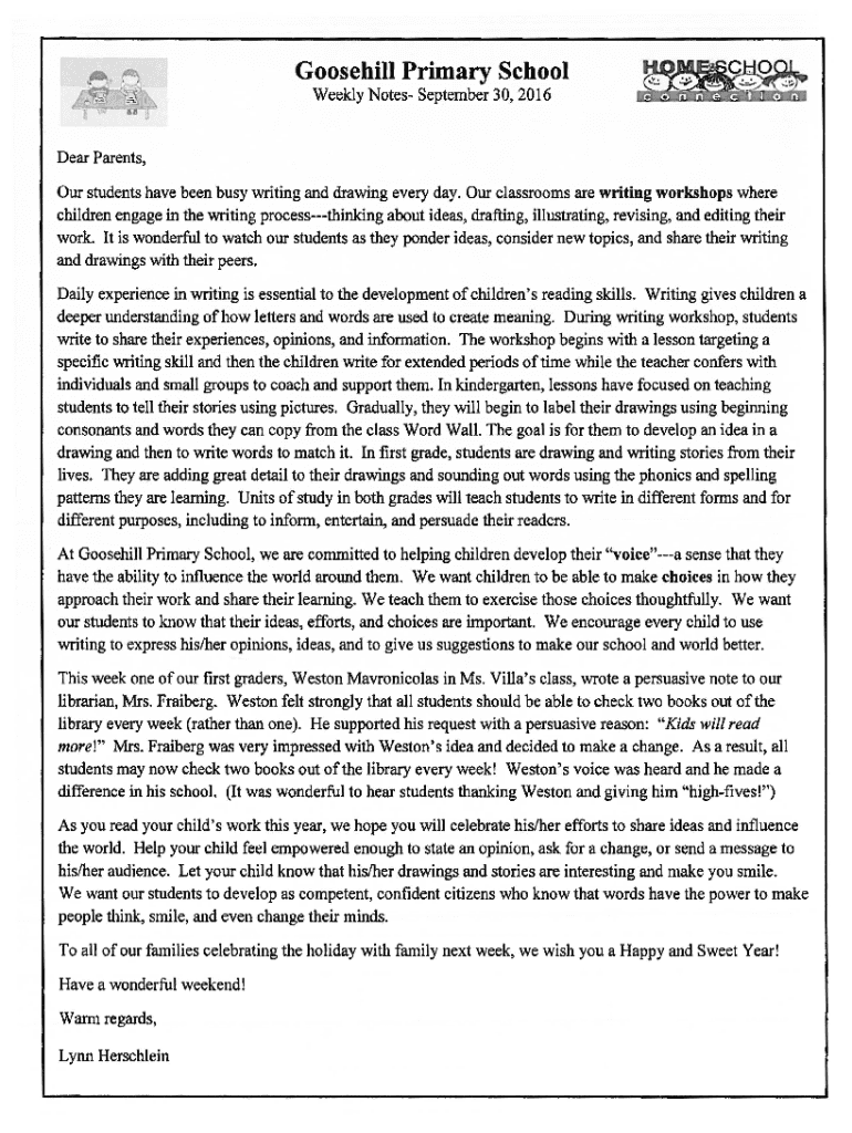 Goose hill Primary School Weekly Notes September 30, 2016Dear Parents, Our students have been busy writing and drawing every day. Our classrooms are writing workshops where children engage in the