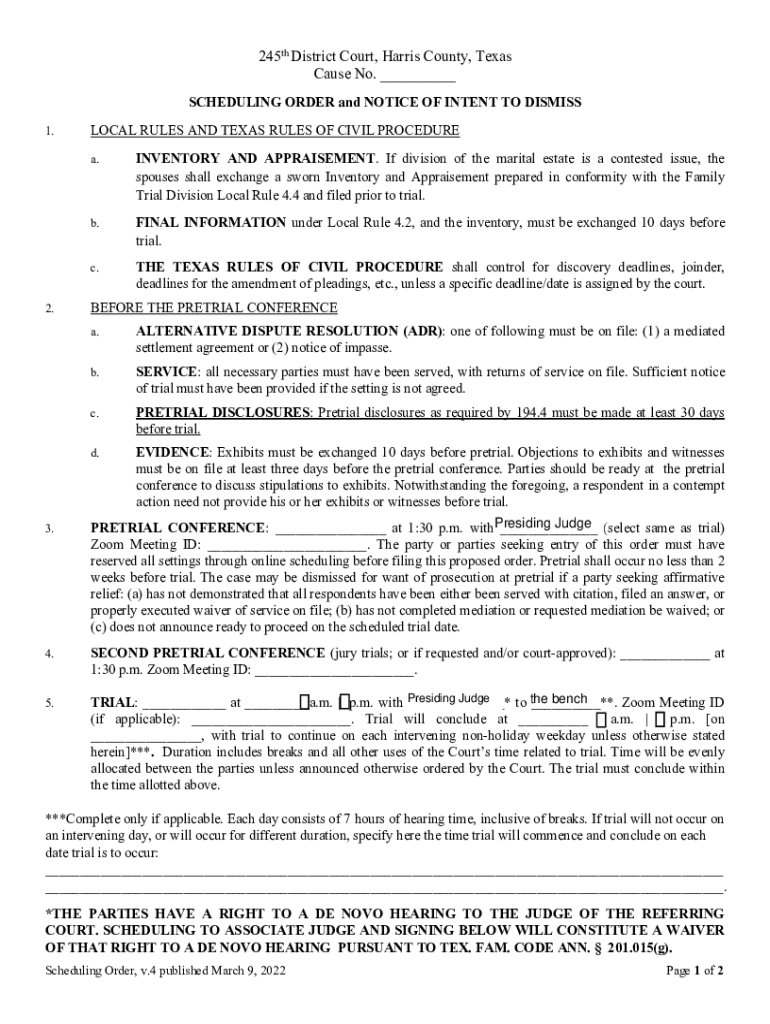 Scheduling order and notice is a document that outlines the timeline and deadlines for a legal case.