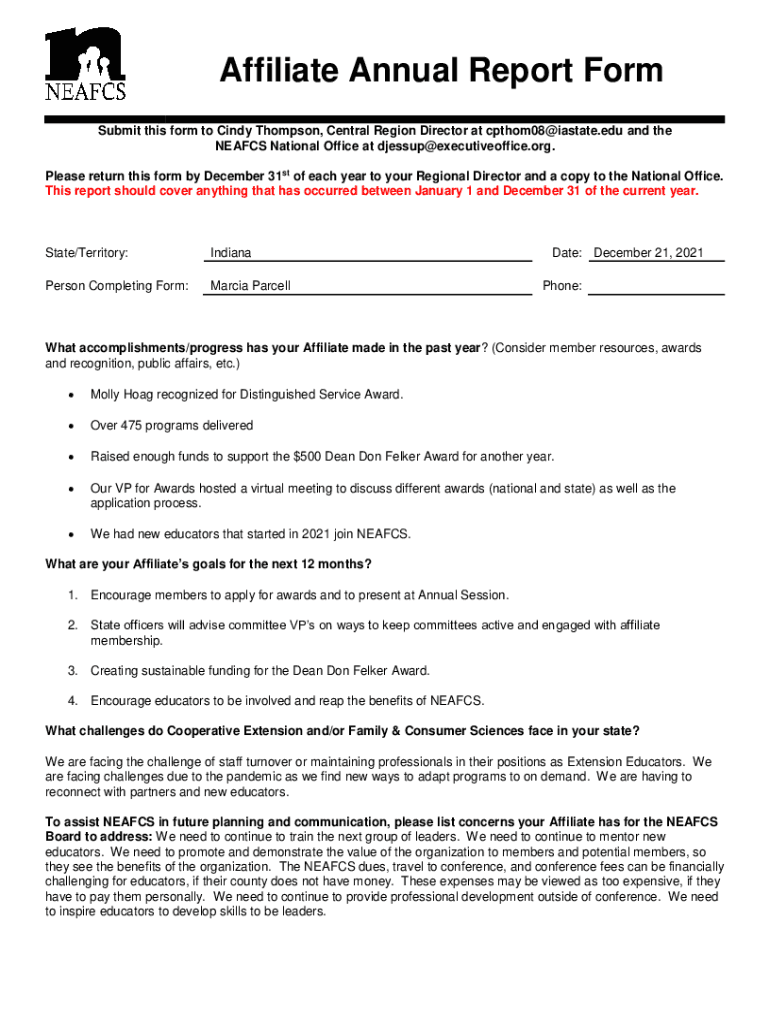 Affiliate Annual Report Form Submit this form to Cindy Thompson, Central Region Director at cpthom08@iastate.edu and the NEA FCS National Office at djessup@executiveoffice.org. Please return this