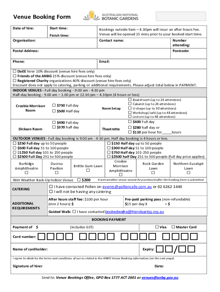 Anyone looking to book a venue managed by Parks Australia is required to file the parksaustraliagovaupubvenue-booking2018 venue booking form.