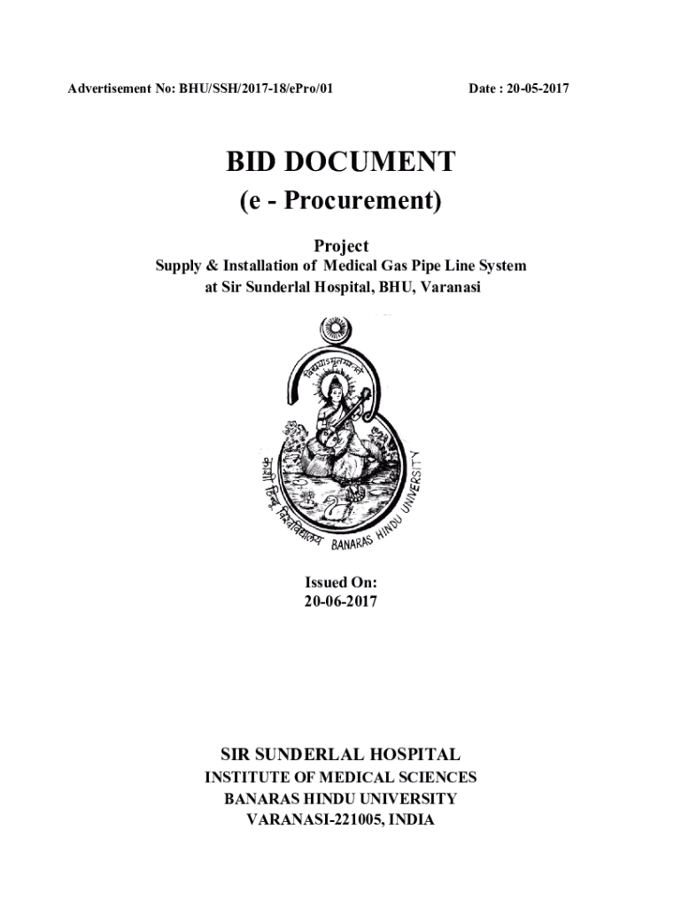 Advertisement No: BHU/SSH/201718/pro/01Date : 20052017BID DOCUMENT (e Procurement) Project Supply & Installation of Medical Gas pipeline System at Sir Underlay Hospital, BHU, VaranasiIssued On: 20062017SIR