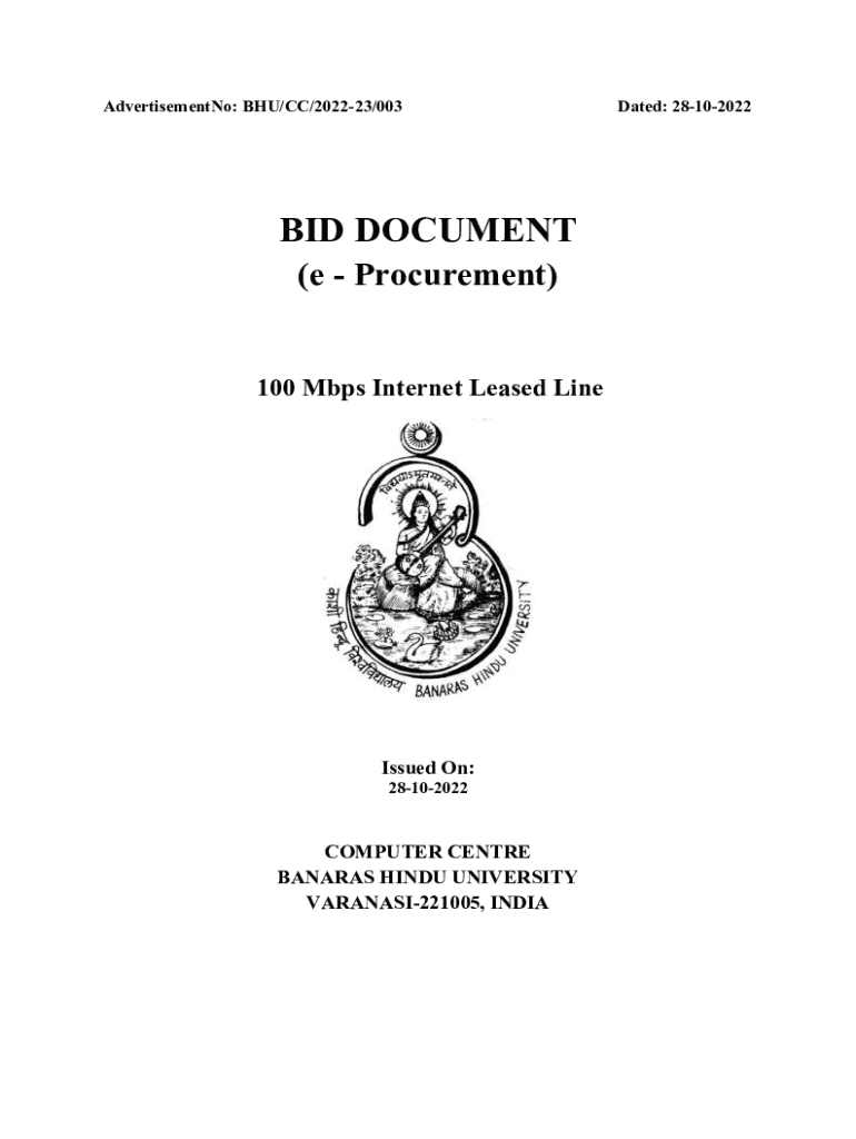 Advertisement No: BHU/CC/202223/003BID DOCUMENT (e Procurement)100 Mbps Internet Leased Reissued On: 28102022COMPUTER Center BANANAS HINDU UNIVERSITY VARANASI221005, Indicated: 28102022This document