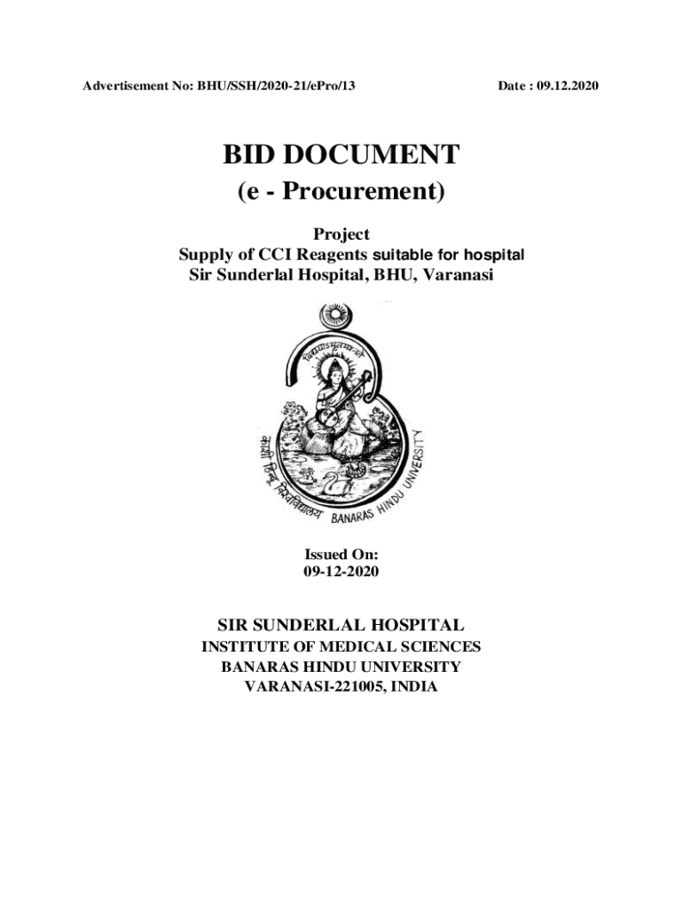 Advertisement No: BHU/SSH/202021/pro/13Date : 09.12.2020BID DOCUMENT (e Procurement) Project Supply of CCI Reagents suitable for hospital Sir Underlay Hospital, BHU, VaranasiIssued On: 09122020SIR