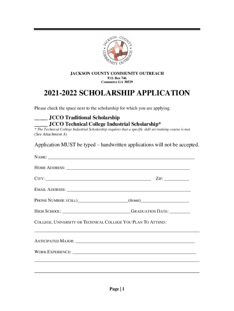 JACKSON COUNTY COMMUNITY OUTREACH P.O. Box 746 Commerce GA 3052920212022 SCHOLARSHIP APPLICATION Please check the space next to the scholarship for which you are applying.___ JCC Traditional Scholarship