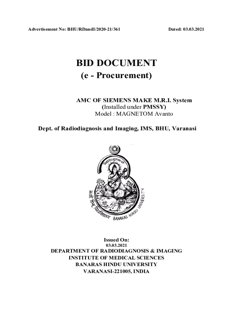 Advertisement No: BHU/Randi/202021/361Dated: 03.03.2021BID DOCUMENT (e Procurement) AMC OF SIEMENS MAKE M.R.I. System (Installed under PUSSY) Model : MAGNETO Canto Dept. of Radio diagnosis and Imaging,
