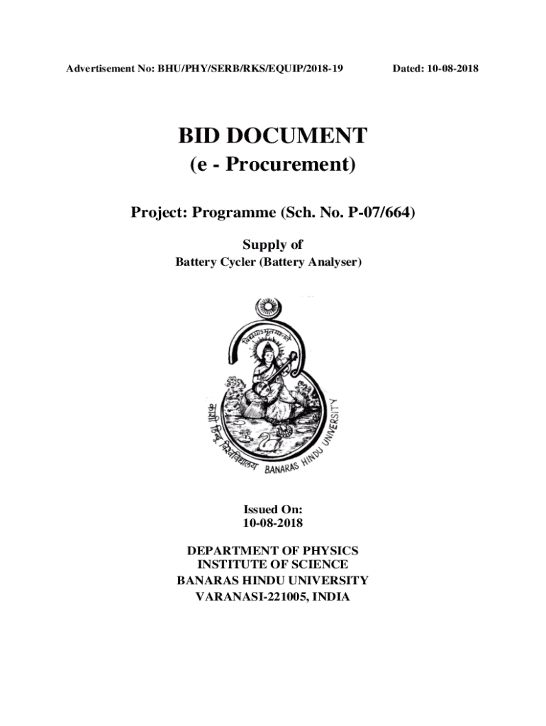 Advertisement No: BHU/PHY/SERB/RMS/EQUIP/201819Dated: 10082018BID DOCUMENT (e Procurement) Project: Program (Sch. No. P07/664) Supply of Battery Cycle (Battery Analyzer)Issued On: 10082018 DEPARTMENT