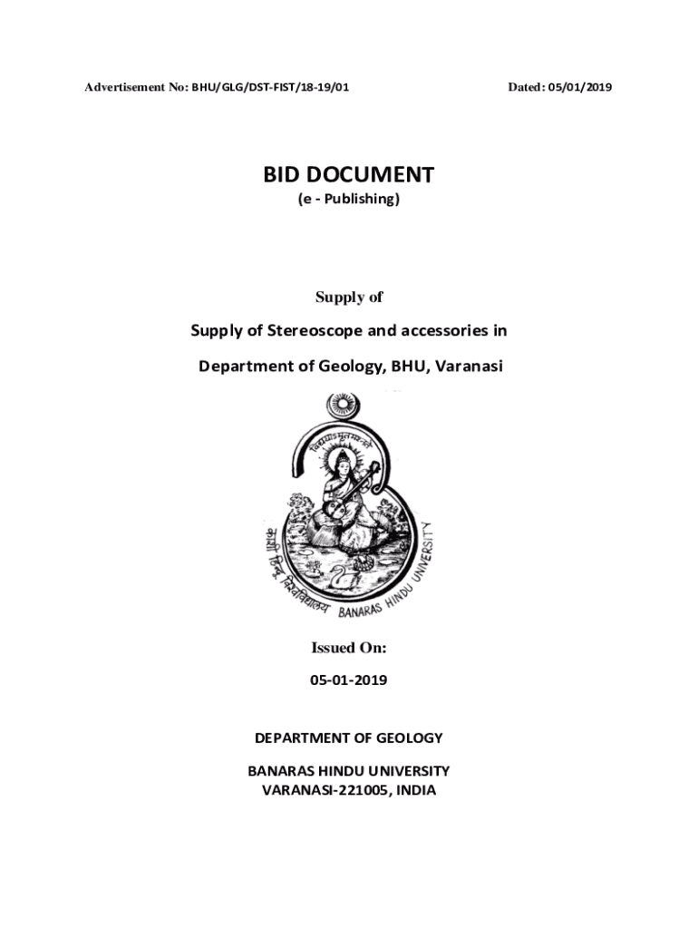 Advertisement No: BHU/GAG/DISTRICT/1819/01BID DOCUMENT (e Publishing)Supply of Stereoscope and accessories in Department of Geology, BHU, VaranasiIssued On: 05012019DEPARTMENT OF GEOLOGY BANANAS HINDU