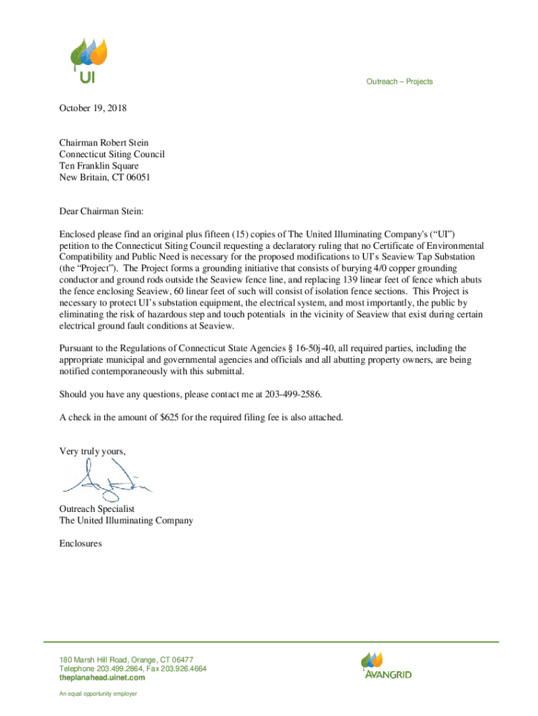 Outreach Projects October 19, 2018Chairman Robert Stein Connecticut Siting Council Ten Franklin Square New Britain, CT 06051Dear Chairman Stein: Enclosed please find an original plus fifteen (15)