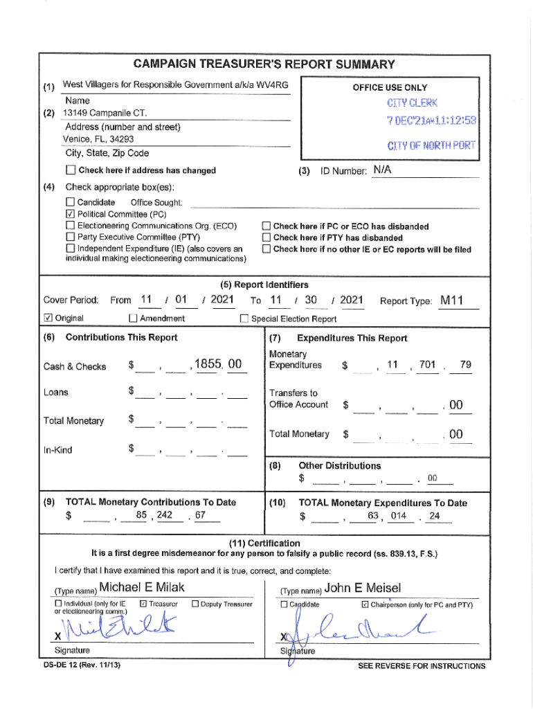 West Villagers for Responsible Government a/k/a WV4RGOFFICE USE Online(2) 13149CampanileCT.CD!::C\'?LHI! U:is*:5&Address (number and street)