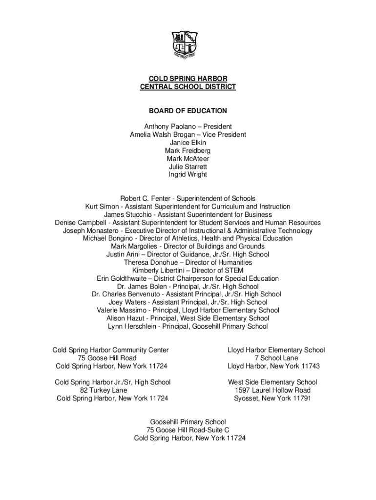COLD SPRING HARBOR CENTRAL SCHOOL DISTRICTBOARD OF EDUCATION Anthony Poland President Amelia Walsh Brogan Vice President Janice Elvin Mark Freiberg Mark McAtee Julie Sterrett Ingrid Wright Robert