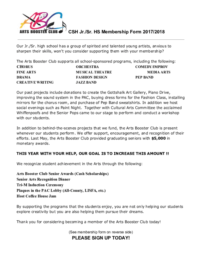 CSH Jr./Sr. HS Membership Form 2017/2018 Our Jr./Sr. high school has a group of spirited and talented young artists, anxious to sharpen their skills, won\'t you consider supporting them with your