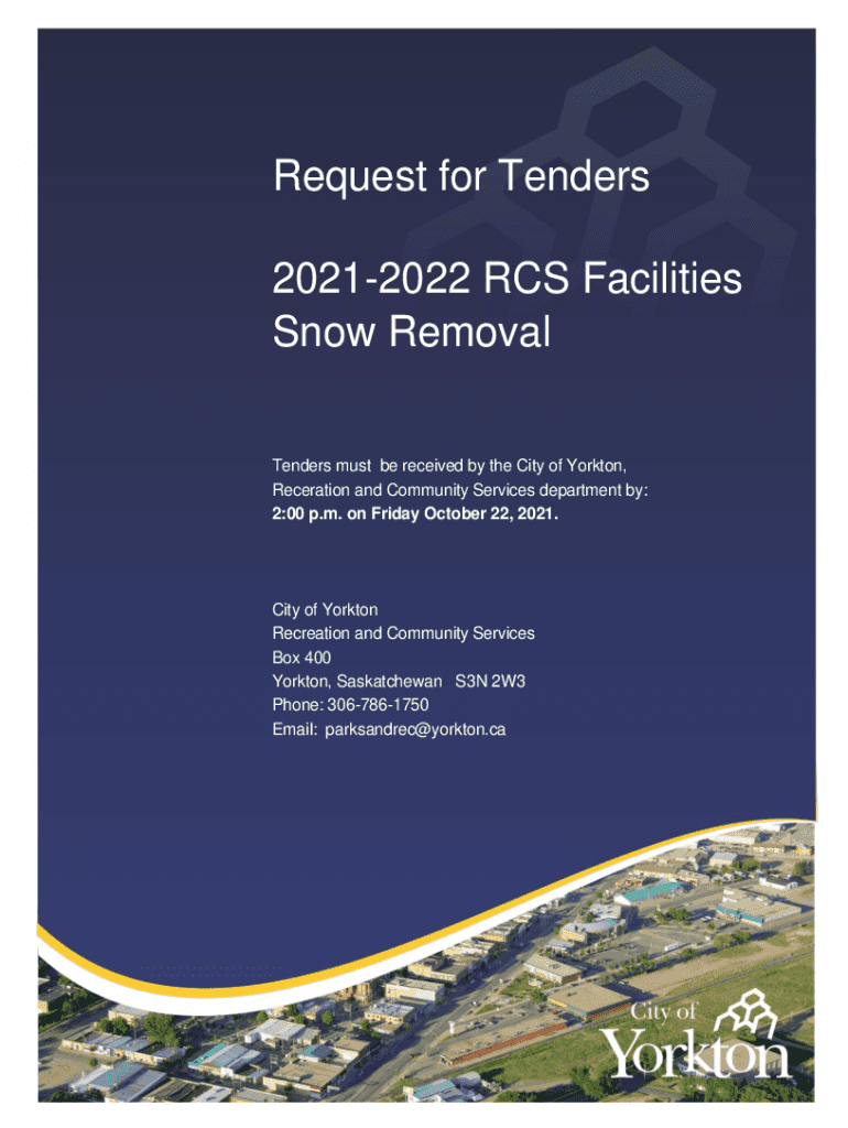 Request for Tenders 20212022 RCS Facilities Snow Removal Tenders must be received by the City of Yorktown, Recreation and Community Services department by: 2:00 p.m. on Friday, October 22, 2021. City