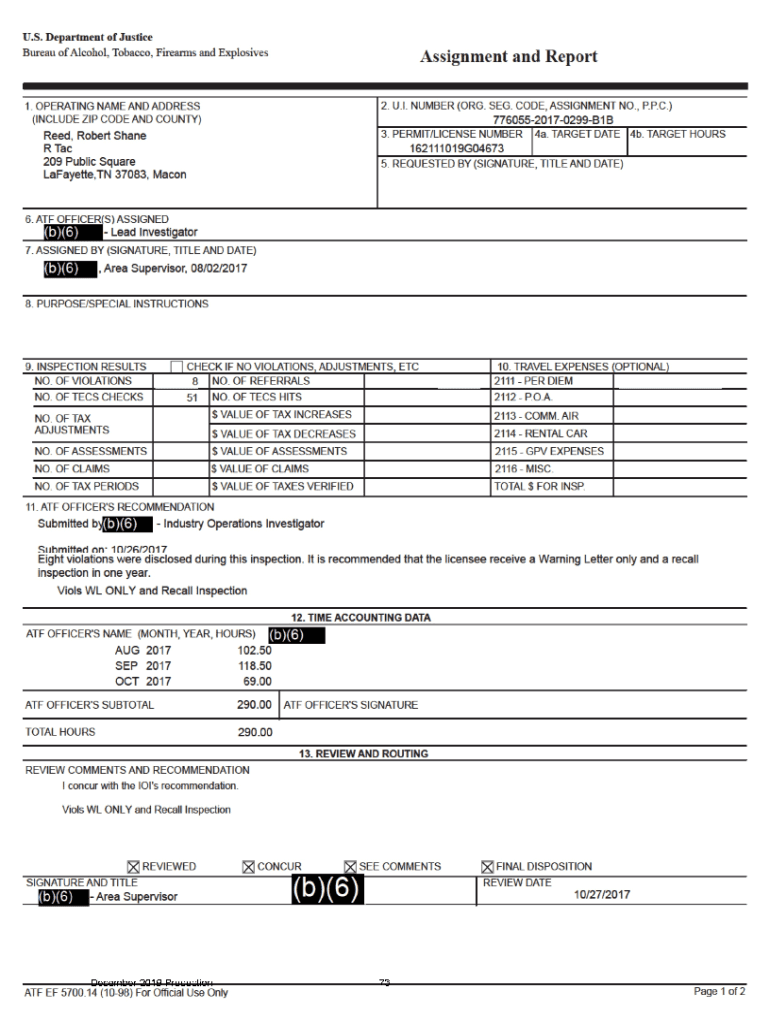 U.S. Department of Justice Bureau of Alcohol, Tobacco, Firearms and ExplosivesAssignment and Report 2. U.I. NUMBER (ORG. SEG. CODE, ASSIGNMENT NO., P.P.C.) 77605520170299B1B 3. PERMIT/LICENSE NUMBER