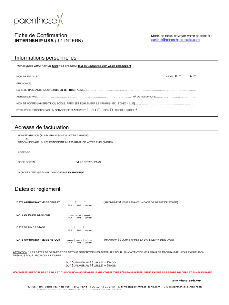 Fiche de ConfirmationMerci de nous envoy her vote dossier : contact@parentheseparis.comINTERNSHIP USA (J1 INTERN)Information personnel Resigned vote no met thus Los proms tells Quintus SUR vote passeportNOM