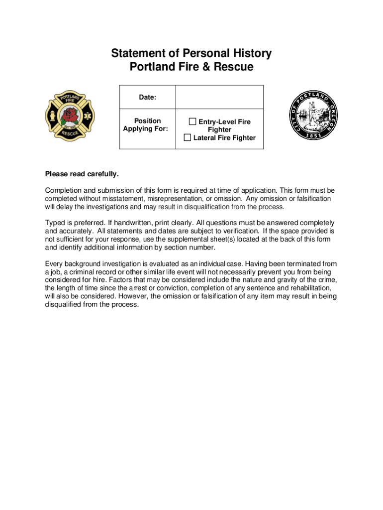 Statement of Personal History Portland Fire & Rescue Date:Please read position Applying For:EntryLevel firefighter Lateral Fire FighterPlease read carefully. Completion and submission of this form