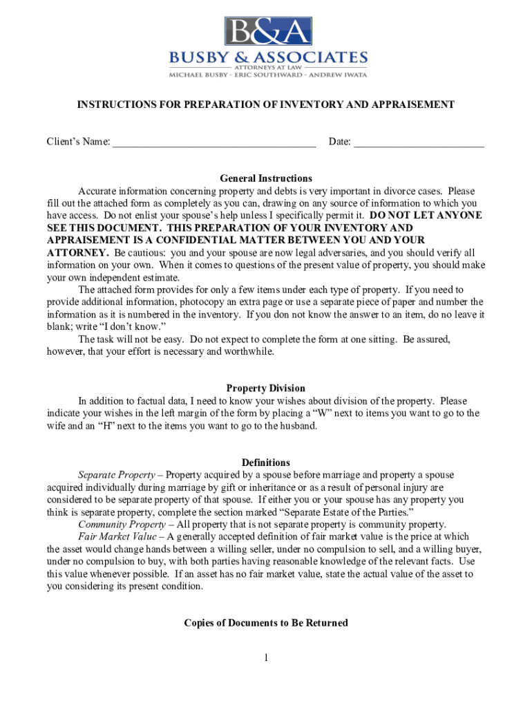 INSTRUCTIONS FOR PREPARATION OF INVENTORY AND APPEASEMENT Clients Name: ___Date: ___General Instructions Accurate information concerning property and debts is very important in divorce cases. Please