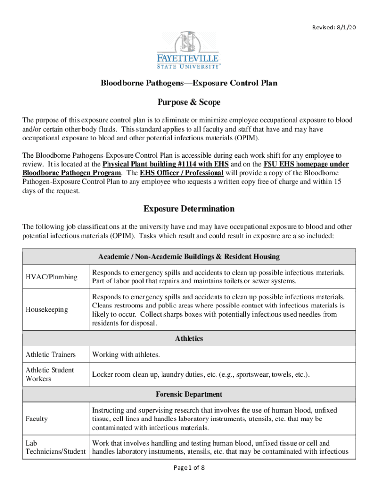 Revised: 8/1/20Bloodborne PathogensExposure Control Plan Purpose & Scope The purpose of this exposure control plan is to eliminate or minimize employee occupational exposure to blood and/or certain
