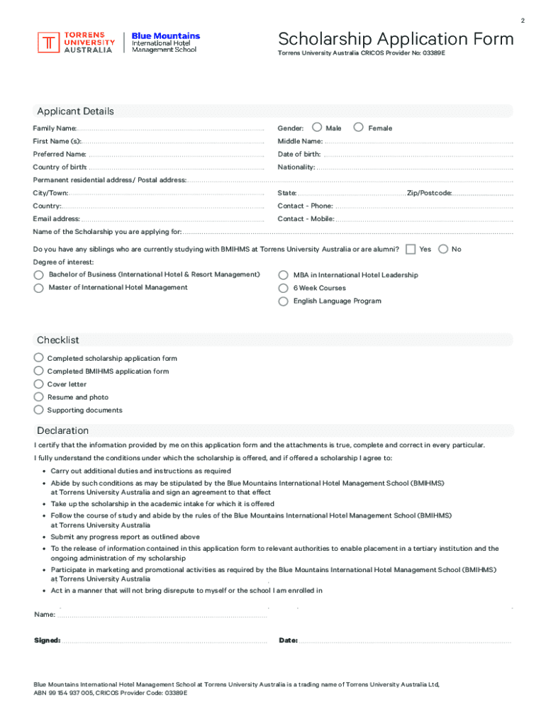 1Scholarship Application Form Torrens University Australia CRICKS Provider No: 03389EBlue Mountains International Hotel Management School (BMI HMS) at Torrens University Australia offers scholarships