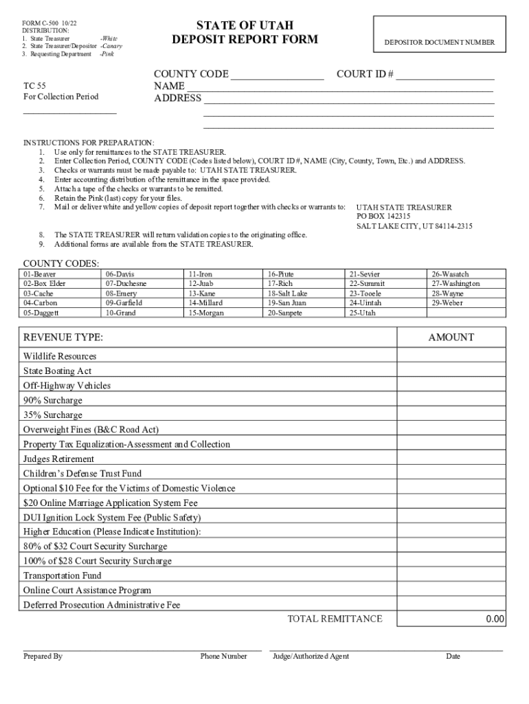 FORM C500 10/22 DISTRIBUTION: 1. State Treasurer White 2. State Treasurer/Depositor Canary 3. Requesting Department Pink TC 55 For Collection Period___STATE OF UTAH DEPOSIT REPORT FORMDEPOSITOR DOCUMENT