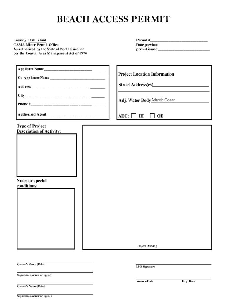 BEACH ACCESS PERMIT Locality: Oak Island CAME Minor Permit Office As authorized by the State of North Carolina per the Coastal Area Management Act of 1974Permit #___ Date previous permit issued___Applicant