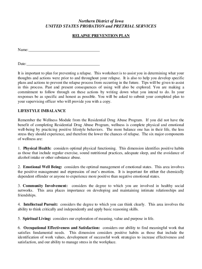 Northern District of Iowa UNITED STATES PROBATION and PRETRIAL SERVICES RELAPSE PREVENTION Planned:___Date:___ It is important to plan for preventing a relapse. This worksheet is to assist you in