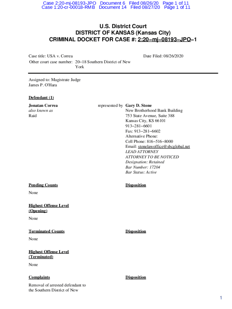Case 2:20mj08193JPO Document 6 Filed 08/26/20-Page 1 of 11 Case 1:20cr00018RMB Document 14 Filed 08/27/20-Page 1 of 11U. S. District Court DISTRICT OF KANSAS (Kansas City) CRIMINAL DOCKET FOR CASE