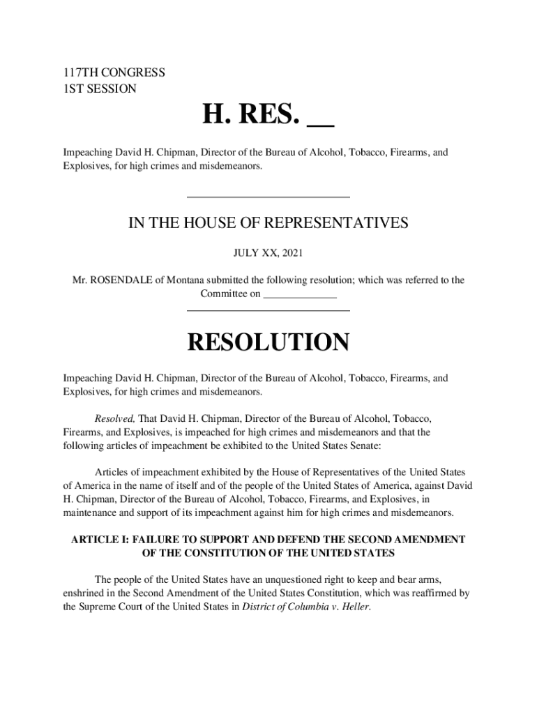 117TH CONGRESS 1ST SESSION. RES. __ Impeaching David H. Chapman, Director of the Bureau of Alcohol, Tobacco, Firearms, and Explosives, for high crimes and misdemeanors. ___IN THE HOUSE OF REPRESENTATIVES