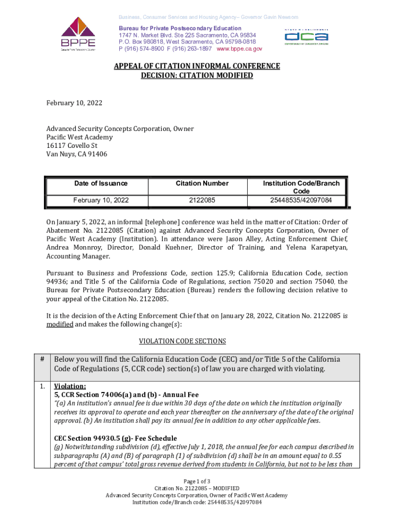 Get the free Bureau for Private Postsecondary Education - Pacific West Academy - Appeal of Citati...