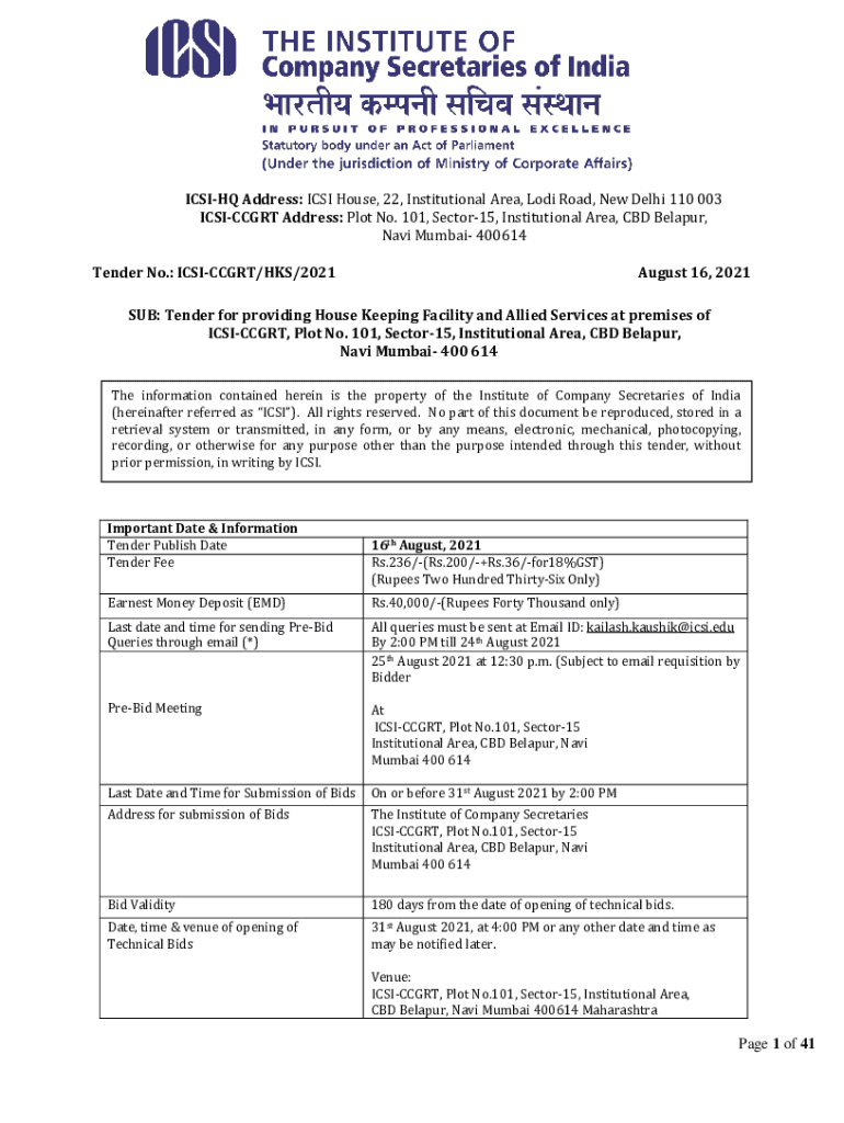 INSIDE Address: CSI House, 22, Institutional Area, Lodi Road, New Delhi 110 003 ICSICCGRT Address: Plot No. 101, Sector15, Institutional Area, CBD Belarus, Navi Mumbai 400614 Tender No.: ICSICCGRT/HIS/2021August