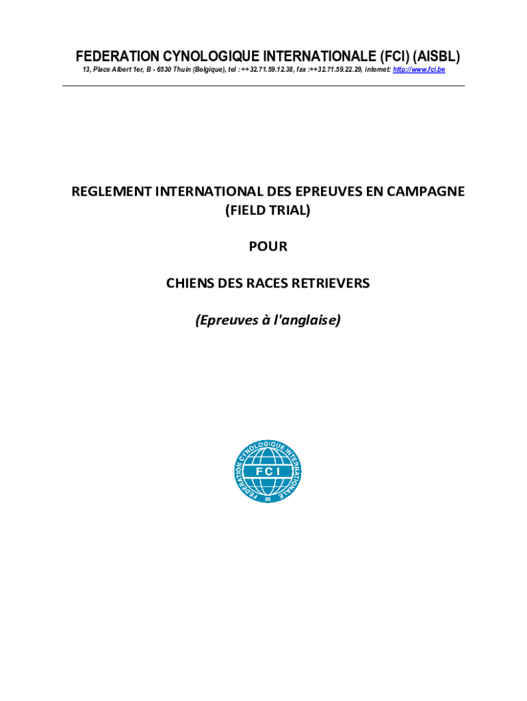 FEDERATION CYNOLOGIQUE INTERNATIONALE (FCI) (ASBL) 13, Place Albert 1er, B 6530 Thin (Belgium, tel : ++32.71.59.12.38, fax :++32.71.59.22.29, internet: HTTP://www.fci.beREGLEMENT INTERNATIONAL DES
