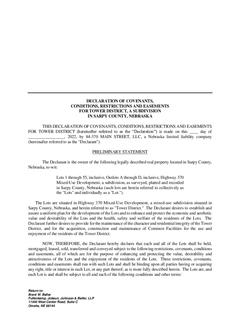 DECLARATION OF COVENANTS, CONDITIONS, RESTRICTIONS AND EASEMENTS FOR TOWER DISTRICT, A SUBDIVISION IN HARPY COUNTY, NEBRASKA THIS DECLARATION OF COVENANTS, CONDITIONS, RESTRICTIONS AND EASEMENTS FOR