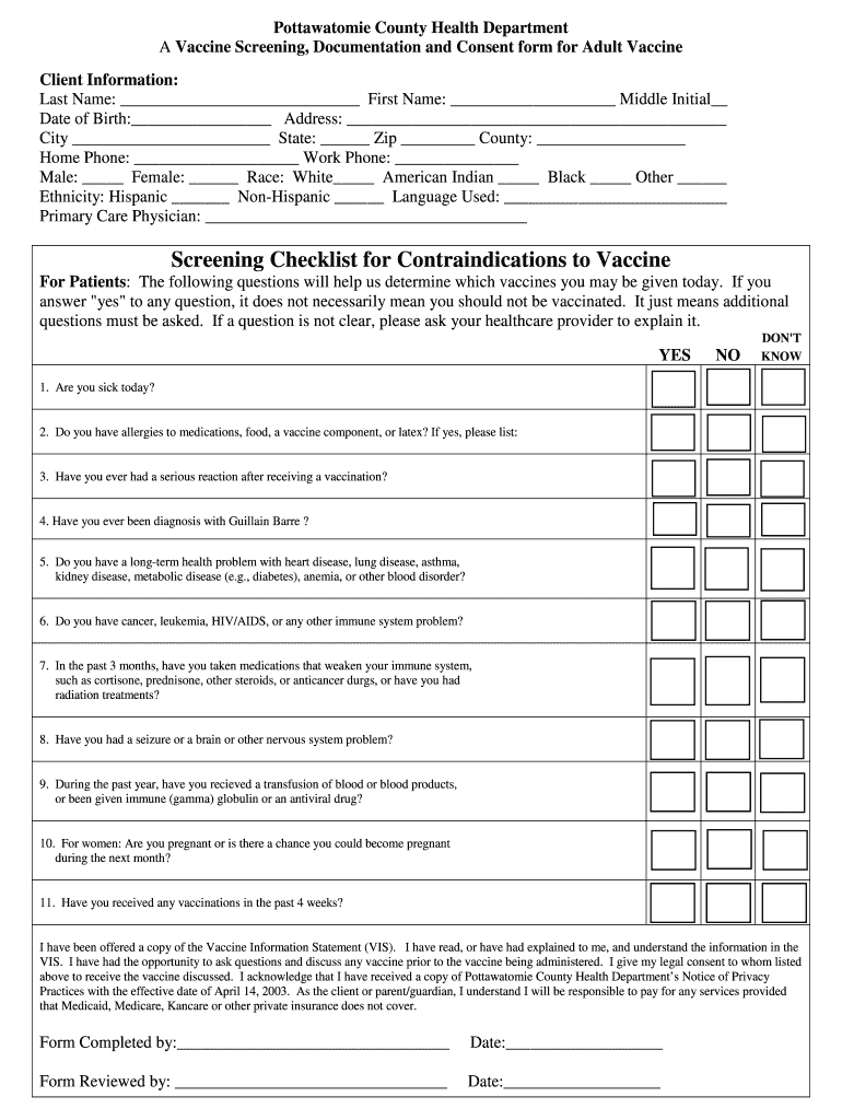 Pottawatomie County Health Department A Vaccine Screening, Documentation and Consent form for Adult Vaccine Client Information: Last Name: First Name: Middle Initial Date of Birth: Address: City State: