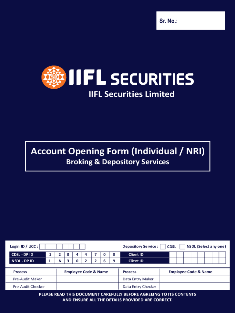 Sr. No.:IFL Securities LimitedAccount Opening Form (Individual / NRI) Booking & Depository ServicesDepository Service :Login ID / UCC : CDs DP ID12044700Client IDSL DP IDIN302269Client IDProcessEmployee