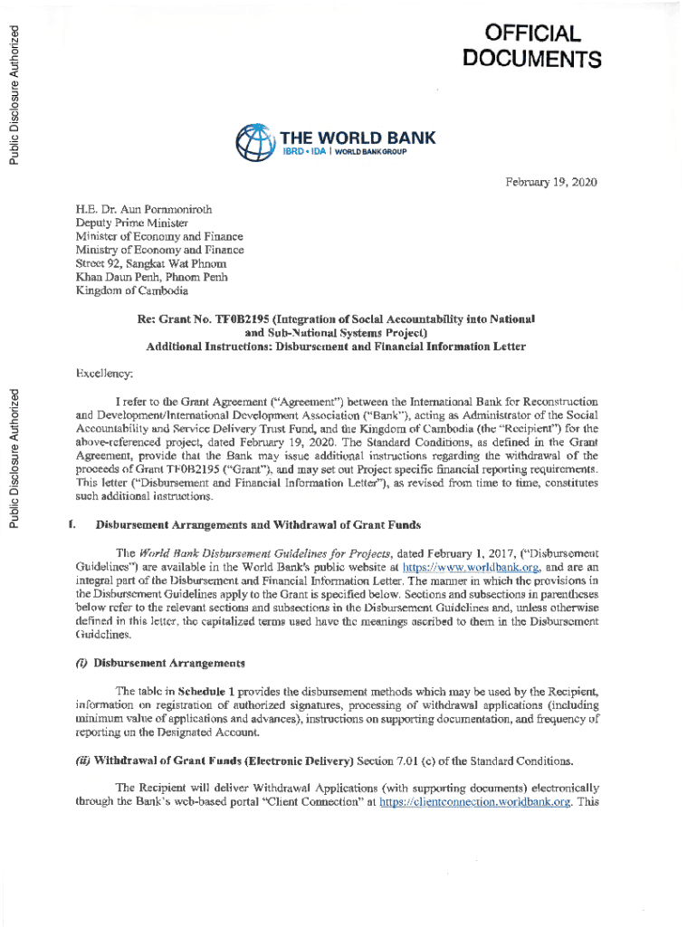 Public Disclosure Authorized WORLD BANK IBID IDA I WORLD BANK GROUP February 19, 2020, Public Disclosure Authorized. E. Dr. AUN Pornmoniroth Deputy Prime Minister of Economy and Finance Ministry of