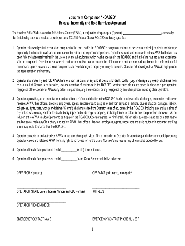 Equipment Competition RODEO Release, Indemnity and Hold Harmless Agreement The American Public Works Association, mid-Atlantic Chapter (APA), in conjunction with participant (Operator), _ that the