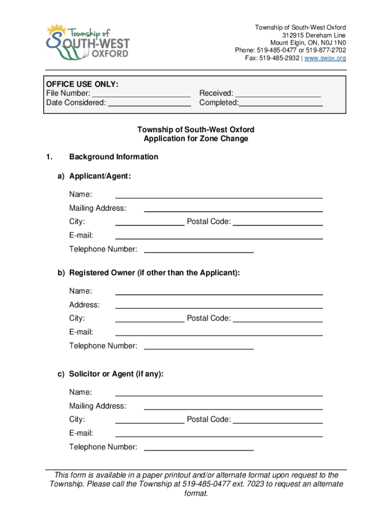 Township of SouthWest Oxford 312915 Dream Line Mount Elgin, ON, N0J 1N0 Phone: 5194850477 or 5198772702 Fax: 5194852932 | www.swox.orgOFFICE USE ONLY: File Number: ___ Date Considered:Received: ___