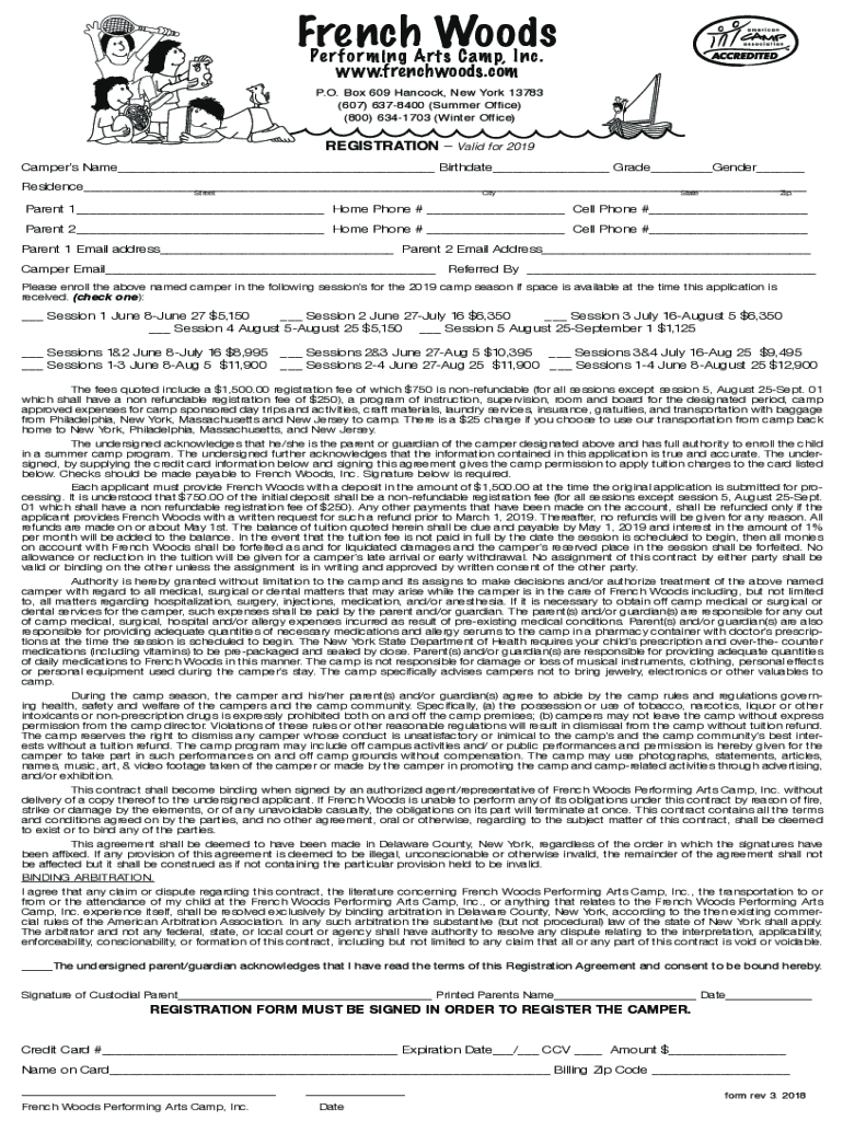 French Woods PE RF or Ming Arts Camp, Inc. www.frenchwoods.comP. O. Box 609 Hancock, New York 13783 (607) 6378400 (Summer Office) (800) 6341703 (Winter Office)REGISTRATION Valid for 2019 Campers Name___