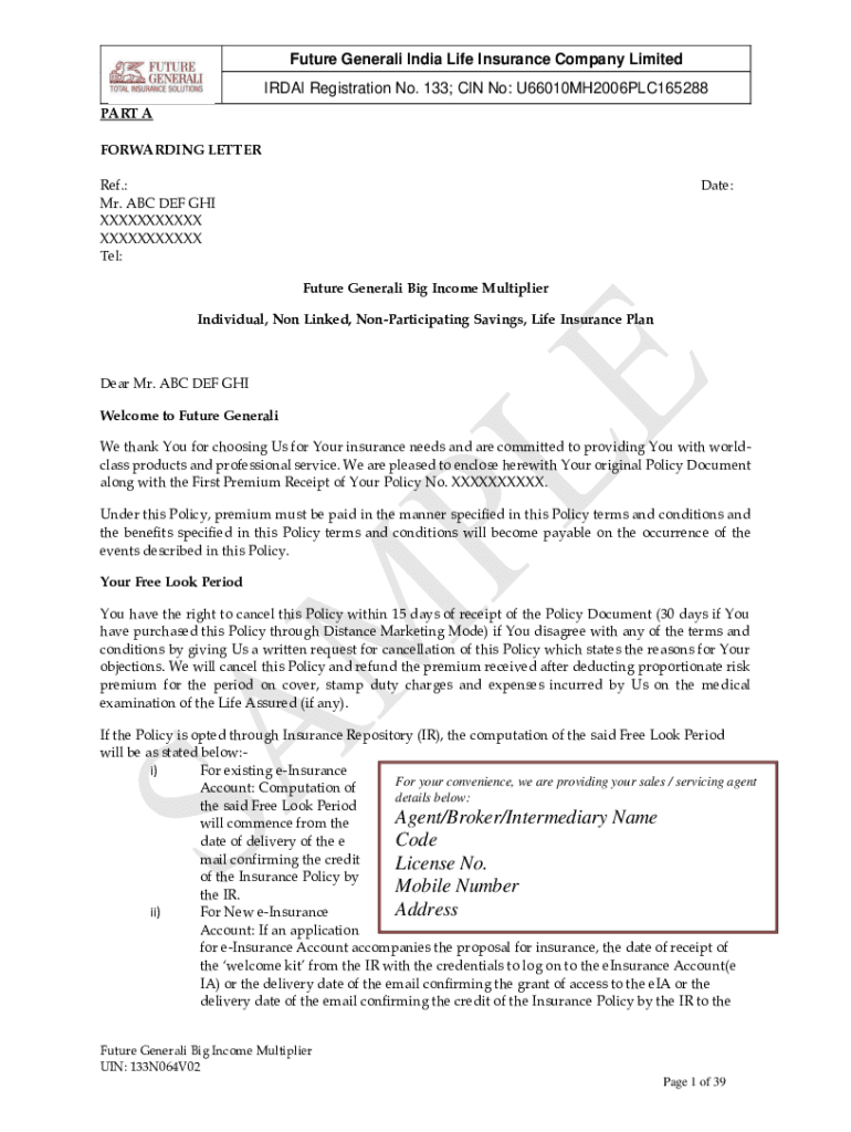 Future Generali India Life Insurance Company Limited IR DAI Registration No. 133; IN No: U66010MH2006PLC165288 PART A FORWARDING LETTER Ref.: Mr. ABC DEF GHI XXXXXXXXXXX Tel:Date:Future Generali Big