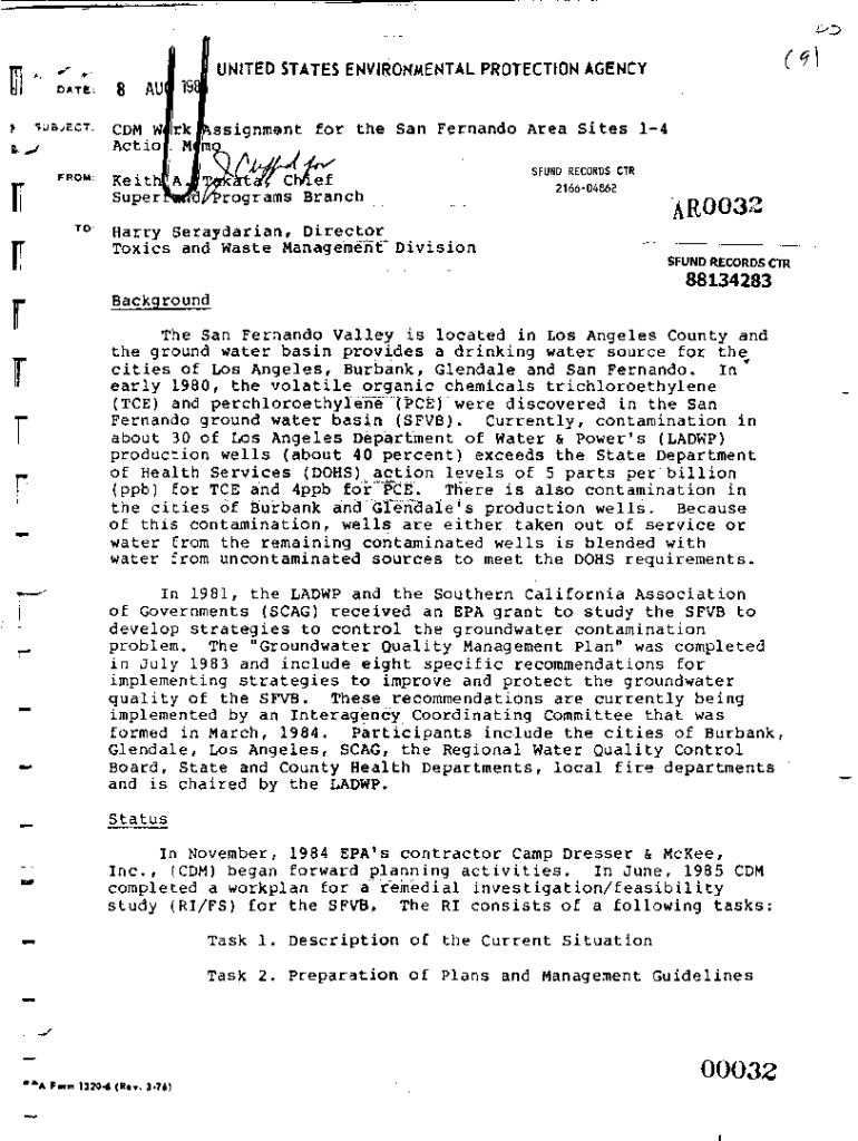 UNITED STATES ENVIRONMENTAL PROTECTION AGENCY DATE:SECT.8COMAUssignment for the San Fernando Area Sites 14W\'Action From r r r rT0Chftef programs Branches Superfund RECORDS CTR 216604862AR003 2Harry