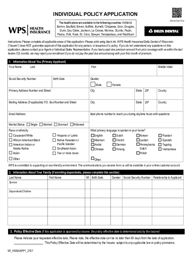 INDIVIDUAL POLICY APPLICATION Internal Use Blythe health plans are available in the following counties: Ashland, Barron, Bay field, Brown, Buffalo, Burnett, Chippewa, Door, Douglas, Dunn, Eau Claire,