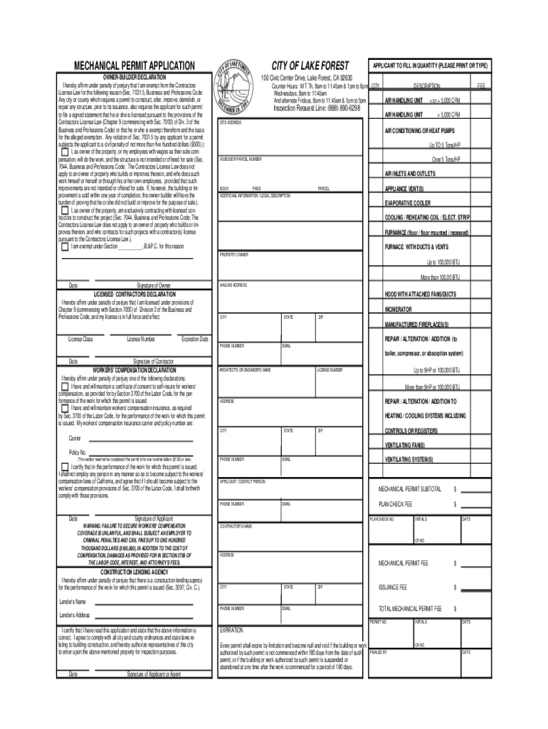 MECHANICAL PERMIT APPLICATION OWNERBUILDER DECLARATION I hereby affirm under penalty of perjury that I am exempt from the Contractors License Law for the following reason (Sec. 7031.5, Business and