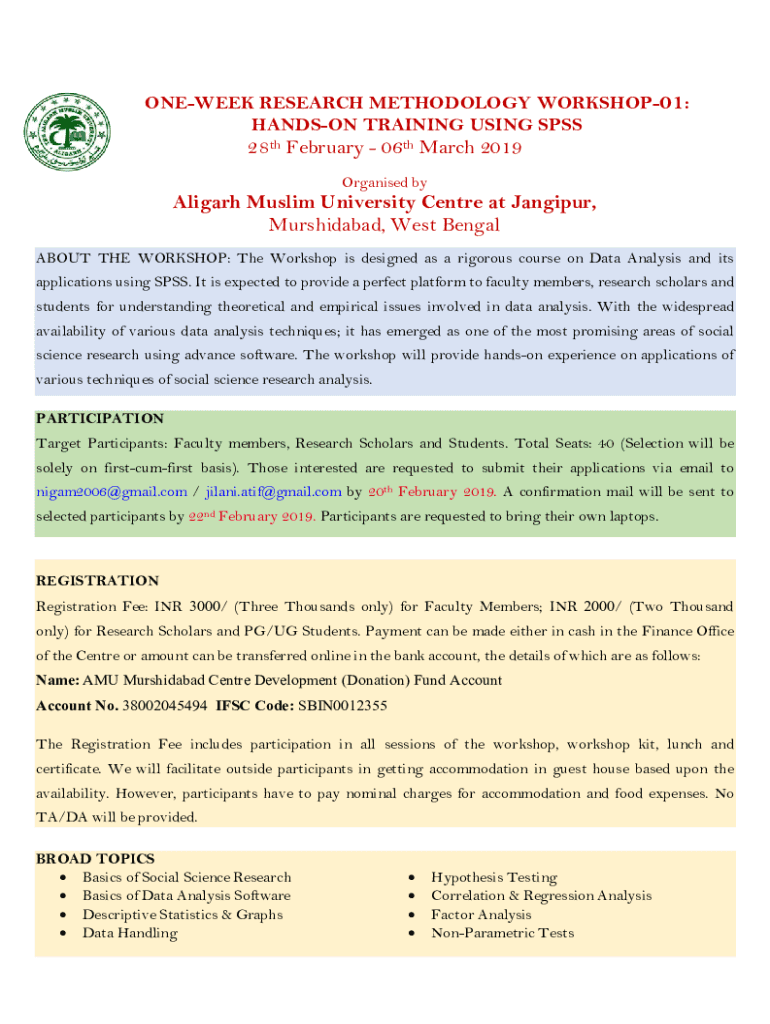NewTek RESEARCH METHODOLOGY WORKSHOP01: HANSON TRAINING USING SPSS28th February 06th March 2019 Organized Aligarh Muslim University Center at Jaipur, Murshidabad, West Bengal ABOUT THE WORKSHOP: The