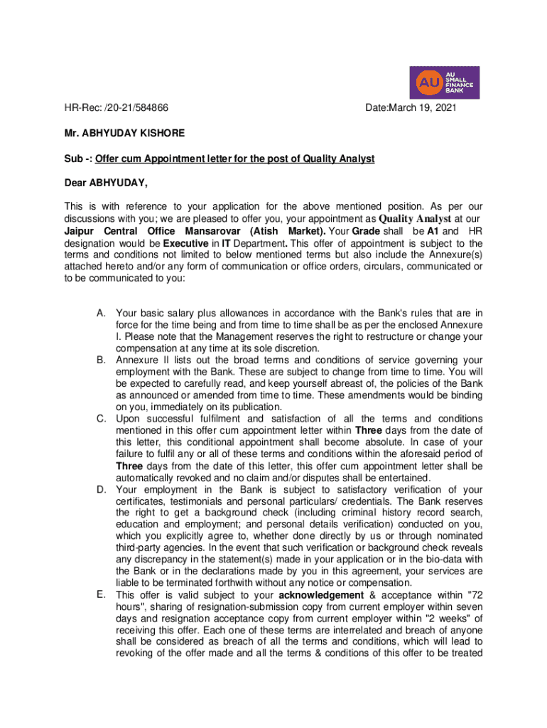 Here: /2021/584866Date:March 19, 2021Mr. ABOUDY KISHORE Sub : Offer come Appointment letter for the post of Quality Analyst Dear ABOUDY, This is with reference to your application for the above-mentioned