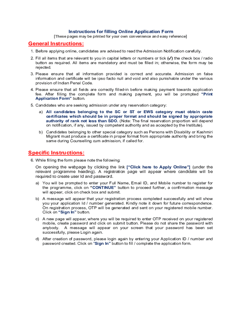 Instructions for filling Online Application Form [These pages may be printed for your own convenience and easy reference]General Instructions: 1. Before applying online, candidates are advised to